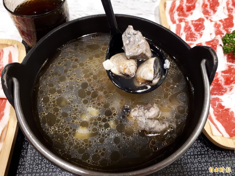 店內的蒜頭蜆湯底和烏骨雞蛤蜊湯底,都是用新鮮食材熬煮,暨養生又美味,是上班族恢復體力元氣的首選。(記者洪美秀攝)